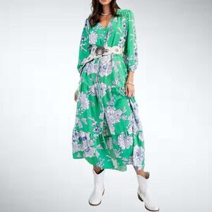 Size 1X Easel Los Angeles Floral Print Tiered Maxi Dress in Green