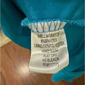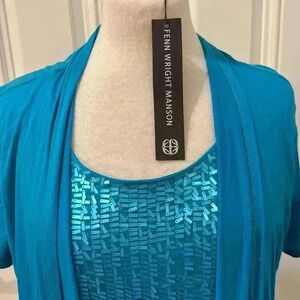 This stunning aquamarine shortsleeved tunic looks like two pieces but is actually one. The lined, scoop neck shirtfront is completely covered in beautiful sequins. It would be perfect for the upcoming holiday season, but also appropriate year round.
