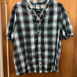 Size 1X - JMS - Short Sleeve Blue and Black Plaid Button-Down Blouse