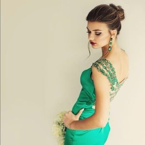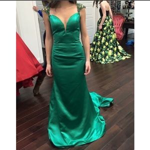 Dress has only been worn twice!! For prom and a pageant (it was a winner!!). Altered to have bra cups in the inside, and a way to pull up the train. Beautiful emerald green. I'm so sad to see it go but it must.