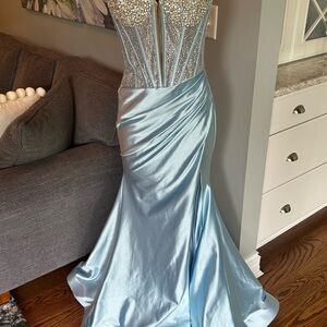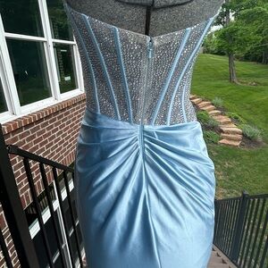 Sherri Hill style 56859 light blue size 2 prom dress. Beaded corset bodice and gem covered cups. Side slit on the skirt and small train. Excellent condition. Smoke free home.