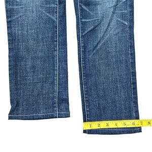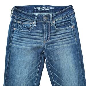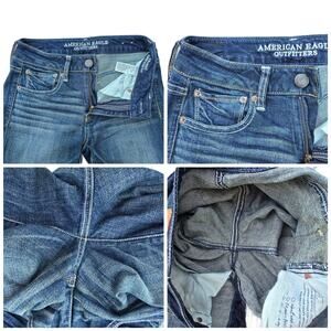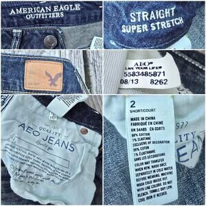 Dark wash super stretch denim w/ factory fading, sanding, whiskering. 5 pocket, button/zipper fly, straight leg silhouette. Minor issues noted in photos. Excellent preowned condition, overall. Size 2 Short 2S by American Eagle Outfitters. Style: Straight Leg Jeans w/ Super Stretch.