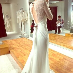 Never worn, never altered wedding dress purchase from Glamour Closet in Chicago. Bodice is satin with Chantilly lace detail. Size 2 but can be easily altered to a size 0. Open back with long train, lace sleeves, and a sweetheart v cut neckline. Still in garment bag.