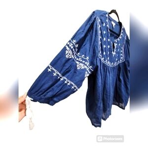Dark blue cotton peasant blouse with white embroidery. 2X and fits true to size. Ties on the sleeves. Measurements: 22-inches chest, 25-inches length.