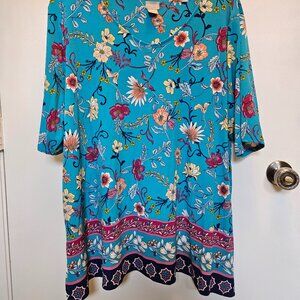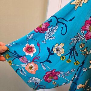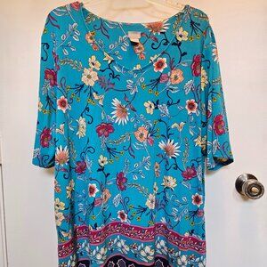 Beautiful teal background with floral print. Stunning colors. Short sleeves, pull over style. Like new condition. Great spring and summer blouse.