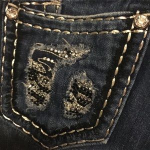 Dark wash jeans with zebra rhinestone accents on the back (missing some rhinestones from wear. You can see it in the picture)
