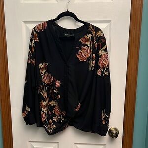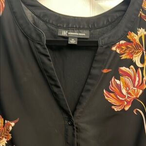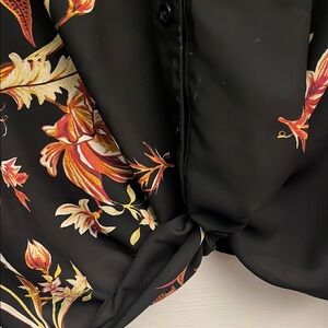 Elegant black blouse with a vibrant floral design. Perfect for any occasion.