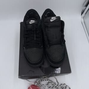 The product is a pair of Jordan 1 OG SP x Travis Scott Low Black Phantom sneakers in size 3 (PS). These athletic shoes feature a low top design and are part of the Air Jordan product line. The black colorway makes them versatile for both boys and girls, and the model is the iconic Air Jordan 1 silhouette. With the collaboration between Jordan and Travis Scott, these sneakers are sure to make a stylish statement for any young sneakerhead.