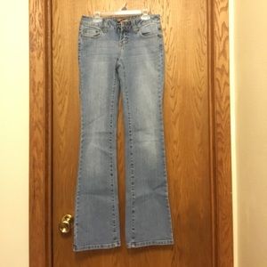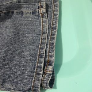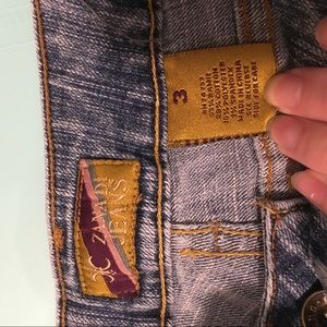Size 3 jeans, light colored. Glittery gems, and pink, yellow, green designs on back pockets. If no gems desired, they can be taken off. Never worn.