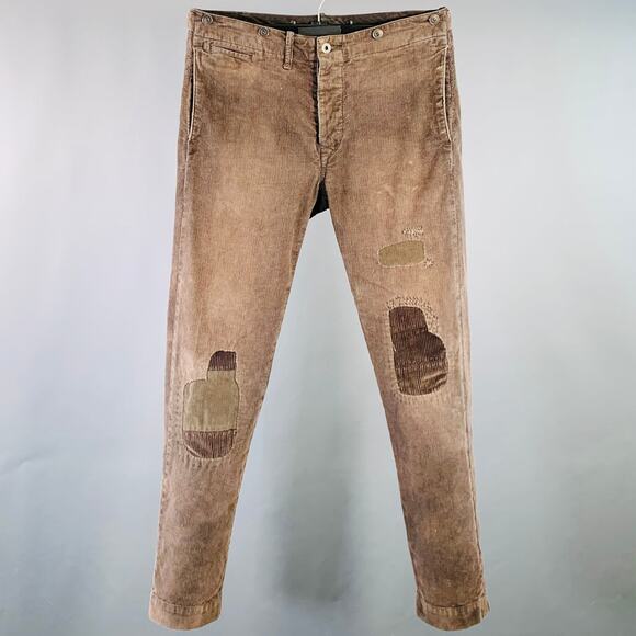 RRL by RALPH LAUREN casual pants in a brown cotton blend corduroy featuring a distressed design, straight leg, and button fly closure.