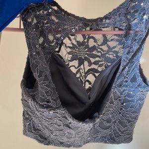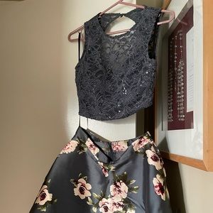Two-piece dress perfect for homecoming, prom or any dance. color is bluish gray is lace with a built in liner.