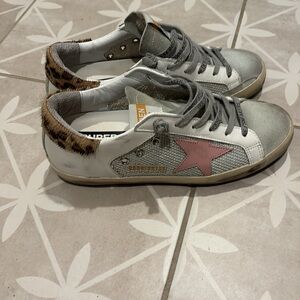 Size 38 Golden Goose Super-Stars. Gray toe, pink star, mesh side, cheetah print back. So sad to part with them but as much as I tired to make my feet shrink to fit the shoes it’s just impossible.