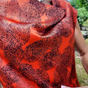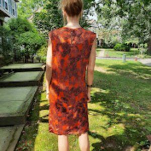 Halloween Eleganza in this 2011 reboot of a Yves Saint Laurent 1970s design. Size 38 The silk charmeuse feels like heaven. The print is a deep orange with black finger prints sprinkled throughout. You will feel like a slinky panther wearing this dress. In very good condition, it is drapey, blouson at the top and narrow at the legs. Bust: 20 Inches Waist: 18 inches Hip 18 inches Length 41 1/2 inches This dress feels and looks amazing!!
