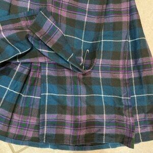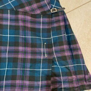 Perfect for highland games! Size 38 Pink/Blue/Black/White Kilt with buckles and kilt pin. Pleated skirt 20" length, up to 22" waist (adjustable buckles). Will fit most size 16W to 18W women.