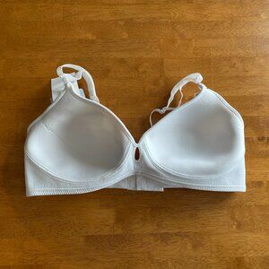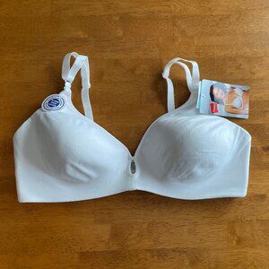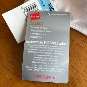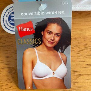 Size 38C Hanes white convertible wire-free lightly padded bra with adjustable straps. Center panel features a keyhole. Seamless coverage, sleek contoured shape with convertible straps. Tag-free.