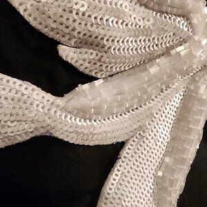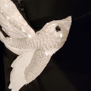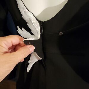 Size 4 BCBG Max Azria "Abigayle" LBD Little Black Dress! Has a stunning white bead and sequin dove bird applique on the low scoop back! Full length slit sleeves. This dress has been customized with added blue and pink embroidery birds on the front right shoulder area. Excellent condition! Short reverse zipper closure.