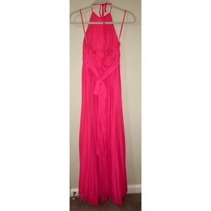 Size 4 Caché Pink Halter High Low Dress made of polyester. Gold and jeweled embellishment at the waist with a ribbon that ties around the waist in the back of the dress.