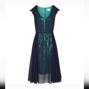 Size 4 Reiss Etta Navy And Teal Seqin Overlay Layered Dress, Ruffled Sleeves