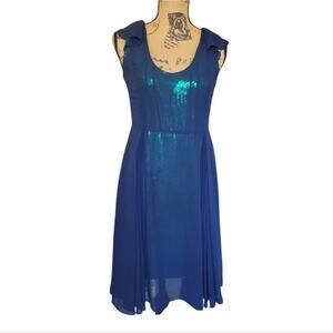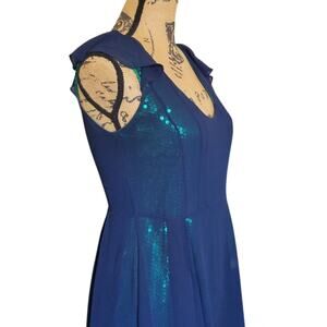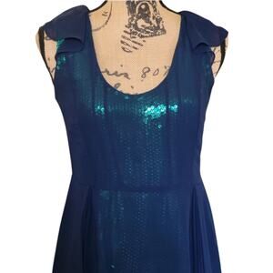 sheer navy blue top layer with gorgeous teal green sequins that make this dress sparkle in the light. photos really dont do it justice. knee length, ruffled cap sleeves, lined.