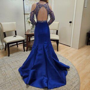 Size 4 Mori Lee gown that would be perfect for prom, pageant, etc.!! Cold shoulder with a long sleeve and a fully beaded and sequin adorned bodice with a vibrant mikado trumpet skirt (little flexibility). A 3 point bustle has been put in so the train can be pick up while wearing.