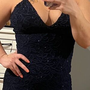 Elegant dress only wore to a wedding once. Size 4, I am 4ft 11 and wearing 5in heels in the picture. Royal blue with design.