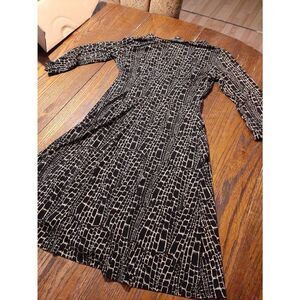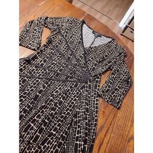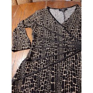 Good Used Condition Women's Size 4P Connected Petite Deep V-Neck 3/4 Sleeve Black and Tan Midi Dress
