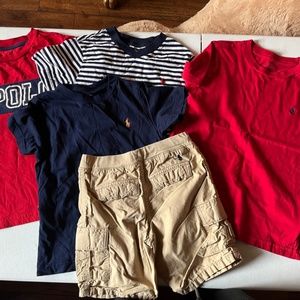 4 polo Ralph Lauren shirts, 1 polo Ralph Lauren long sleeve shirt, 1 polo Ralph Lauren shorts, 1 Nike shorts, 1 Jordan shorts, 1 marvel shorts