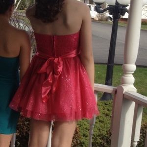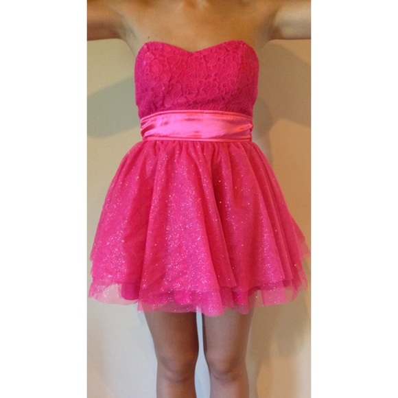 Pink, poofy, sparkly bottom, lace top & strapless prom/homecoming dress. Size 5. Worn once.
