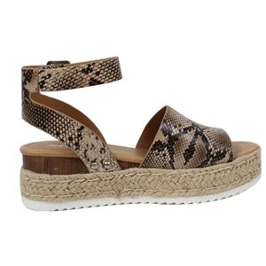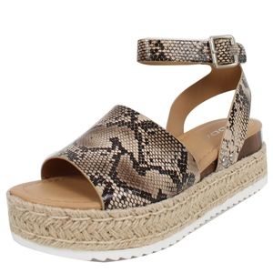 Natural Python open toe halter ankle strap espadrille flatform sandal. Platform 1 1/2" to 2 1/4". Model is a size 7, she is modeling a size 7 which fits her perfectly.