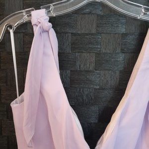 This dress is floor length and flowy, with decorative ties on the shoulders. The sheer overskirt is short in front and long in back, and the solid under layer is floor-length all the way around. Bought for $125, selling for $60. As-new, never used, smoke free house, needs to be steamed but is in otherwise perfect condition.