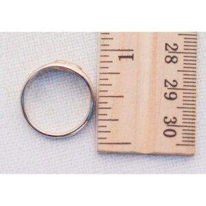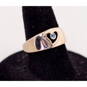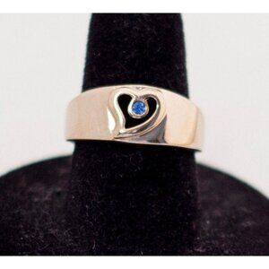 Size 6 3/4 gold tone ring, with heart shape cut out and tiny blue stone, made by Avon.