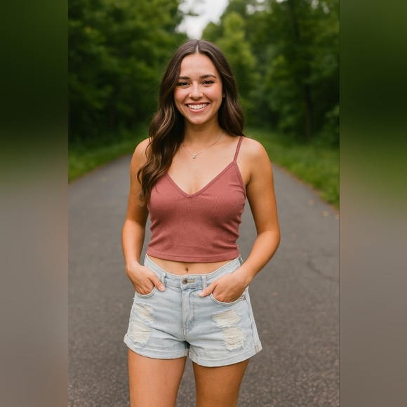Stylish blue jean shorts with a distressed look. Ideal for everyday wear. 092725