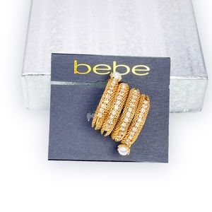 Gold toned mesh coil ring by Bebe with faux pearl and rhinestone accents.