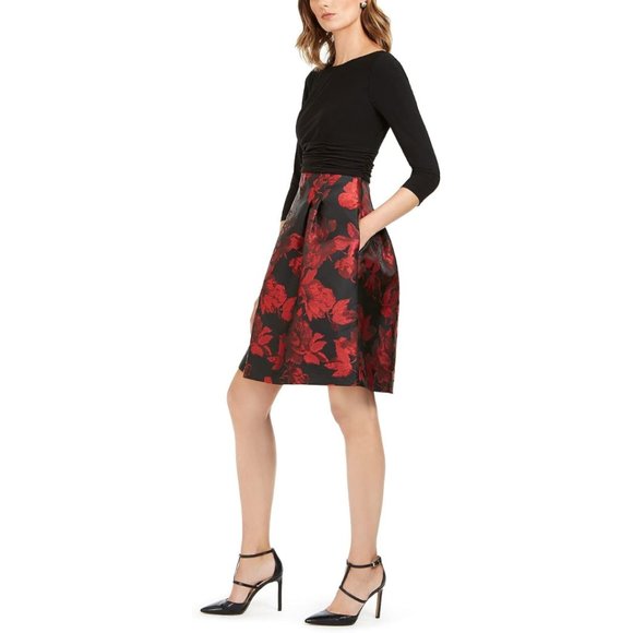 Jessica Howard floral dress with a stretchy bodice and delicate ruching at the waistline. The dress features three-quarter-length sleeves, a jewel neckline, and an A-line skirt.