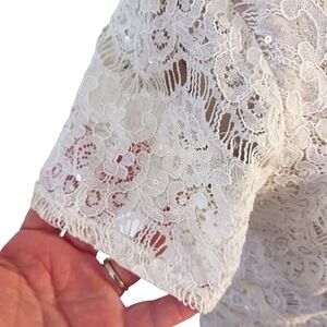 Beautiful bodycon or sheath style dress in an ivory colored lace with white sequins to give it a touch of spakle. Perfect for a small wedding, civil wedding, vows renewal, a bridal shower or rehearsal dinner.