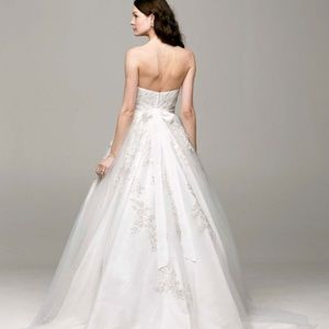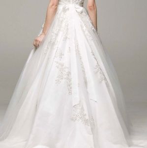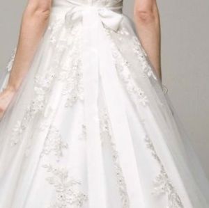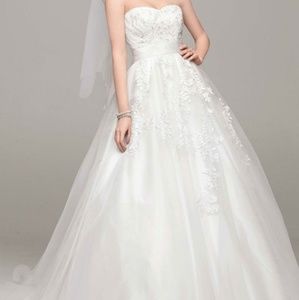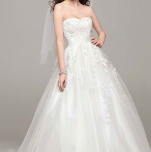 Strapless bodice with beaded lace applique detail and tulle ball gown. Ribbon can be tied in the front, back or removed.