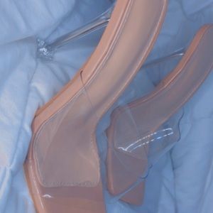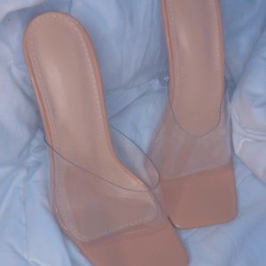 Clear high heel shoes. Pointed bell. Slide in shoe.