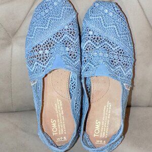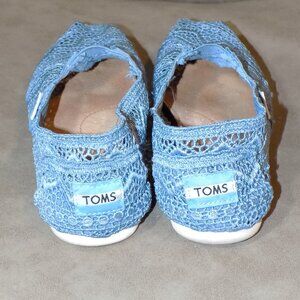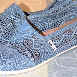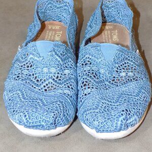 Nice, gently used condition. The crochet material used has a sheen to it. Unique combination of patterns created in the crochet work. Medium blue with white semi-flexible soles. I don't see any wear on the insoles. Matching blue elastic section at the top of the foot. Toms tags on outer sides & backs. Gently used.