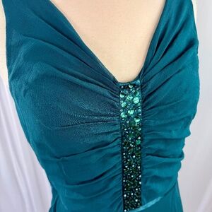 Beautiful color! 100% silk dress with emerald green sequin detail on top. Sleeveless dress with side zip and beautiful trim around waist. Cleaned and in excellent condition.