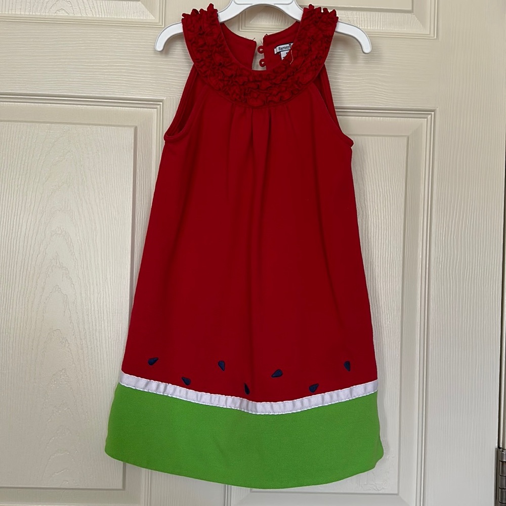This is a brand similar to Janie & Jack. The pique dress has ribbon and embroidered seeds. It is LIKE NEW condition.
