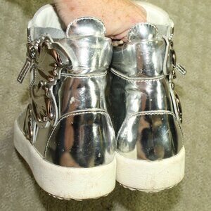 The product is a pair of Giuseppe Zanotti silver patent high top winged shoes in size 7 (UK) or 37 (EU). These stylish sneakers feature a double zip closure, leather lining, and rubber outsole. The design includes accents such as wings and a shiny silver color, perfect for a modern and athleisure look. Made in Italy, these shoes are suitable for various occasions including activewear and casual outings, with a touch of Italian designer flair.
