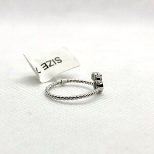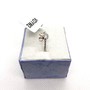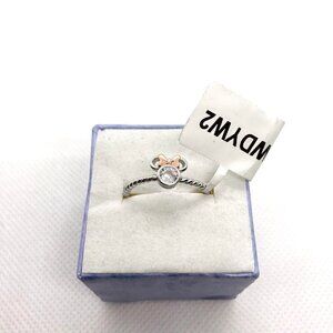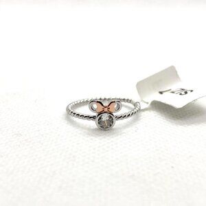 Size 7. Solid 925 sterling silver Minnie Mouse ring. The ring is Minnie’s head’s silhouette, with a large clear lab-created sapphire crystal as her head and empty ears, and a rose gold toned bow on top. The band is braided / twisted style.