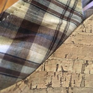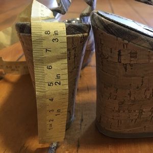 Size 7 American eagle wedges. 3 inch heel. Silver buckle thing on front. Open toe. Cork like wedge heel. Brown tan and Grey plaid wedges