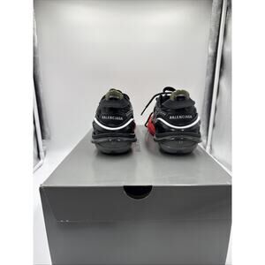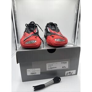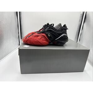 The product is a pair of Balenciaga Tyrex Low sneakers in a size 7, featuring a low top design and made of black leather with red accents. These athletic shoes are part of the Balenciaga Tyrex product line, known for their colorful theme and stylish design. Perfect for women looking for a fashionable yet functional sneaker option.