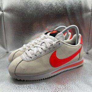 The Nike Cortez Premium Platinum Tint Bright Crimson Women's Shoes in size 7 feature a stylish lace-up closure and are perfect for casual occasions during the summer, fall, and spring seasons. Made with a rubber outsole for durability, these sneakers provide arch support, cushioning, comfort, and breathability. The white color with red accents and Nike logo detailing adds a touch of sporty style to these athletic shoes, making them a fashionable choice for women who appreciate both style and functionality in their footwear.