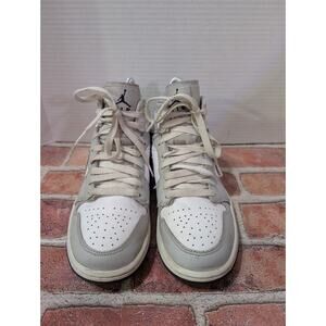 The product is a women's size 7 Nike Air Jordan 1 Mid in Light Smoke Grey Fog, featuring a lace-up closure and a mid-top silhouette. This vintage sneaker is part of the Air Jordan product line and is designed for athletic activities like gym training, basketball, and school. With its classic retro theme and logo accents, this shoe offers comfort and cushioning, making it suitable for all seasons. Made with leather uppers and a rubber outsole, this shoe is a stylish and versatile choice for any sneaker enthusiast.