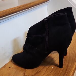 Size 7 black booties ruched scrunched heels side zipper suede spring brand preow