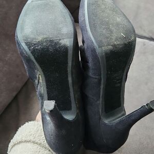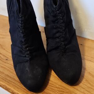 Size 7 black booties ruched scrunched heels side zipper suede spring brand preowned size 37 ankle boots