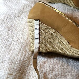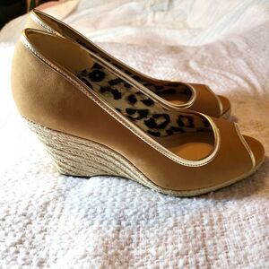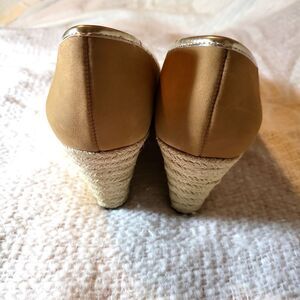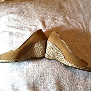 like new, gently preloved , tan in color,outlined in gold, jones of new york wedges size 7.5, gorgeous!