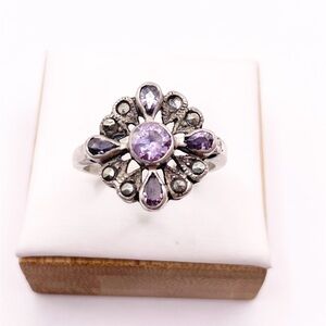 Size 8. Amethysts gemstones, Marcasites 925 stamped sterling silver ring. Good condition. Beautiful ring!